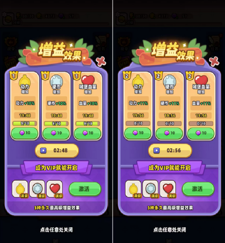 暗线设计部分,由游戏内难度实现。首先是游戏局内增强,《Gear Defenders》在对战内还设计了类似《史莱姆大作战》《次神·光之觉醒》类的“限时buff”,玩家每次可1次观看广告即可触发3个Buff,但每次观看广告具有CD等待时间。设计上,以历史累加形式呈现,10次之后Buff效果也会增加。