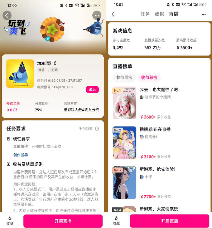 与此同时,该游戏1月8日在抖音发行人计划中发布的视频与直播任务,吸引数千名创作者参与,带动视频观看量超2亿,直播观看人次也超300万。凭借“魔性鸽子”的热梗效应,话题发酵传播还在持续,已形成了“游戏内容+达人传播”的高效裂变闭环。