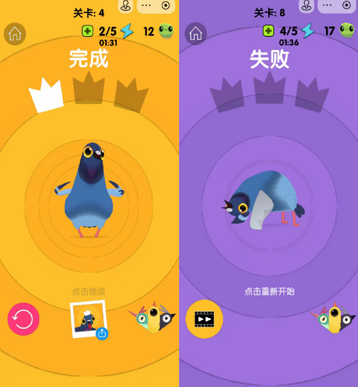 二是魔性内容的植入,每当玩家通关,鸽子便会自动跳起“雷霆舞姿”,扭头、甩尾、摆翅膀的连贯动作搭配魔性音效,不仅成为通关后的正向反馈,更自带社交传播属性,让“疯狂鸽子跳舞”成为抖音热梗,激发用户自发分享二创,形成UGC传播浪潮;