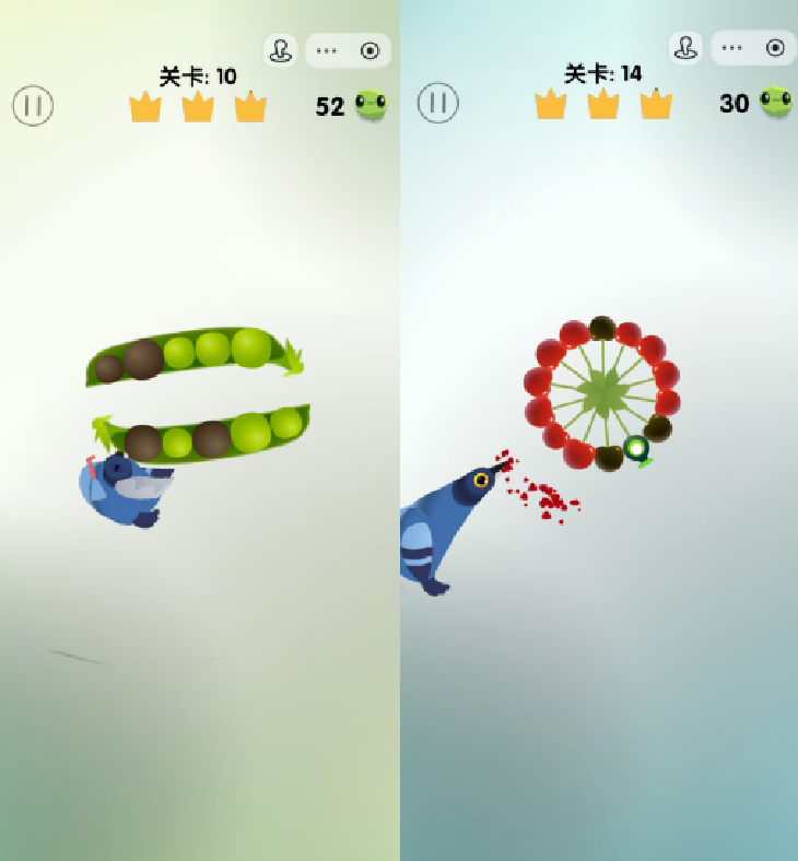 该产品能在抖音火爆,罗斯基认为是玩法逻辑清晰易懂,延续了经典《见缝插针》类游戏的轻操作内核,却将核心元素进行了趣味重构:原本的转盘替换为玉米、豌豆、西瓜、石榴等一系列贴近生活的食物道具,“针”则升级为可爱的鸽子,玩家需在限时内操控鸽子啄食食物,同时规避石头等障碍物完成闯关,收集过程中获得的虫子可兑换多样皮肤与新造型,限时通关对应着获取皇冠数,三个皇冠是满分,给予玩家持续目标感。