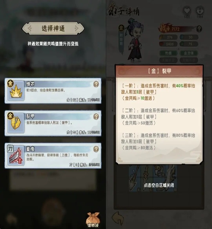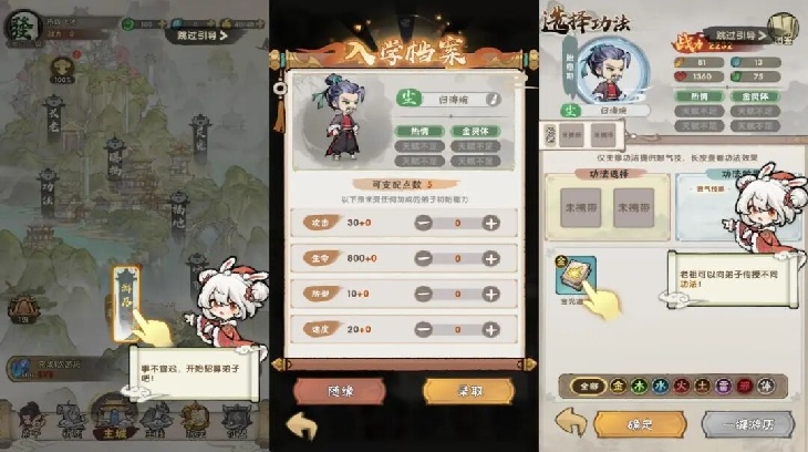其核心玩法围绕“游历”展开。每次游历可招募一名弟子,弟子拥有随机天赋与能力,玩家也可手动分配能力点。随后需为弟子选择一部功法,功法不仅能提供属性加成,还附带“怒气技”。准备就绪后,即可开始游历。