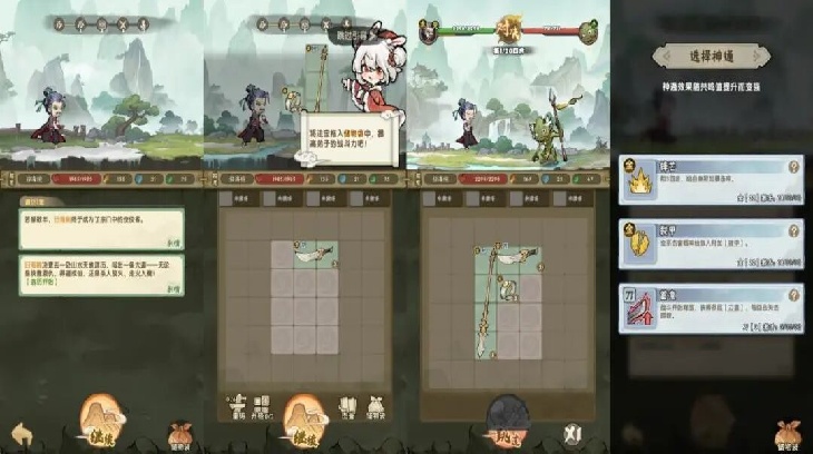 同时,在游历中还会遇到随机的神通,选择后可以获得额外的能力。神通需要对应的属性点才能激活,属性点来自于对应属性的武器。