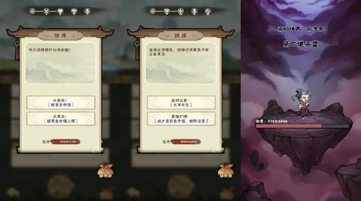 目前已知的事件大致分为三类:直接奖励类、战斗类及二选一类。直接奖励类通常附带简短剧情,完成后直接获得法宝;战斗类需击败随机敌人以获取奖励;二选一类则提供不同分支选项,比如恢复生命/提升生命上限、以生命换取法宝/忽略事件、消耗生命抽取随机属性/放弃等,本质是“高风险高收益”与“稳健选择”之间的权衡。