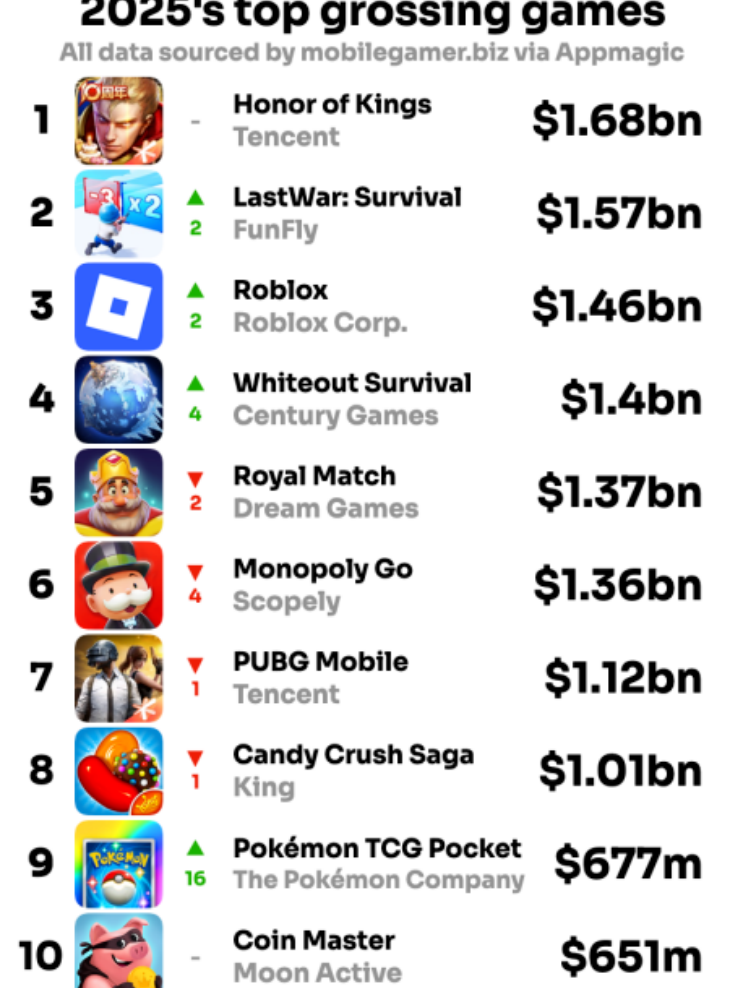 在近年海外SLG的辉煌战绩中,由FunFly开发的《Last War:Survival》是近几年最亮眼的产品之一。据外媒Mobilegamer.biz发布的《2025年全球手游收入榜》显示,《Last War:Survival》2025年累计收入超过了15.7亿美元,仅次于《王者荣耀》,位列榜单第2名。