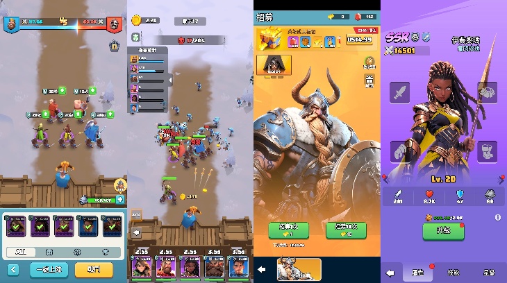 战斗方面,游戏以抵抗帝国为核心剧情,前期以防御战为主,达到一定进度后解锁推图玩法。虽然采用卡牌推图模式,但战斗表现略有不同:场景类似塔防,敌人从上方进攻,我方英雄部署于下方。除了英雄自动作战外,玩家点击屏幕还可控制领主以弓箭攻击敌人。前期战斗很大程度上依赖领主输出,这一点与《咸鱼之王》有相似之处。