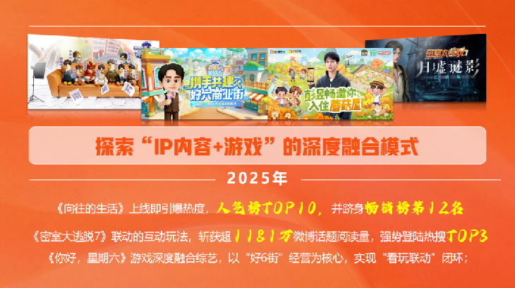 为了让IP价值最大化,2026年我们将推出定制综艺这一创新合作模式,旨在打造IP与游戏双向赋能的新范式。我们将发挥芒果打造爆款综艺的核心团队和资源,为合作游戏量身定制专属综艺内容,实现游戏的世界观、角色、剧情与节目内容的原生融合,超越传统广告的简单曝光;游戏玩法及奖励机制可反向深度植入综艺环节,驱动观众即时转化为玩家;更具吸引力的是,这种合作模式成本可控,形式灵活,综艺产生的正片、花絮、名场面等海量素材,将成为游戏长期营销的优质内容库,实现一次合作,持续赋能。