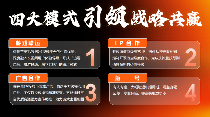 为了让合作伙伴们更便捷地共享这份生态红利,我们推出了四大核心合作模式:第一芒好玩平台的游戏联运,深度融入长视频用户场景,实现 “边看边玩、粉丝共鸣”;第二 IP合作,开放海量顶级综艺IP,提供从授权联动到定制开发的全维度合作,完成从流量获取到情感深耕的价值升级;第三广告合作,依托千万级核心用户池,以精准投放与平台资源助推游戏破圈;第四版号服务,专人专案缩短申报周期、规避流程反复,专业保障提高获批成功率。我们希望通过以上的四种合作模式,和大家一起实现战略共赢。
