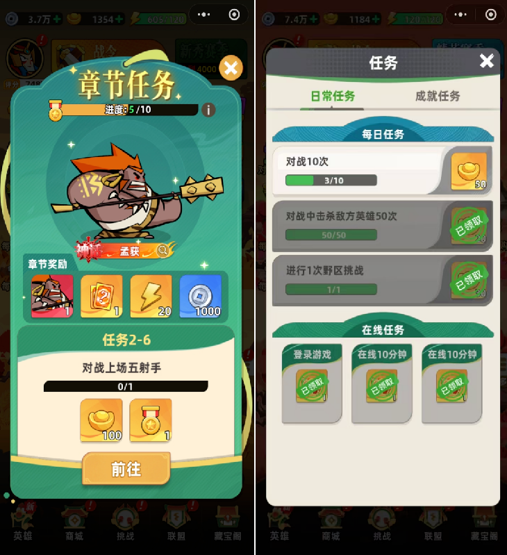 任务方面,《王者之弈》以章节任务形式设计,每章节10任务形式提供,每次完成单章节全部任务后,则解锁红色品质卡牌。然而,在《王者之弈》内,玩家虽然通过较为简单的条件实现逐步挑战,但是缺乏有效的引导。《王者之弈》主要养成设计底层在于全量养成,养成通过抽卡实现,由招募券及元宝支持。元宝设计上,玩家获得元宝数量为10,每级英雄养成以双倍形式递进。对于绝大多数玩家而言,遵循“付费+游戏内提供”的形式,达成持续养成的条件。而“游戏提供”,比如常见的升级其他卡牌提高收藏等级获取资源,却缺少了确保玩家培养成为习惯的设计穿插。从游戏长线运营逻辑来看,《王者之弈》遵循“挑战——养成”的高频循环。虽然章节闯关提供英雄为奖励,但是围绕全量养成的英雄养成方式未能确保培养习惯,以及玩家获取新的搭配时,没有确保对应阵容的核心及游戏机制。并且,玩家从“平衡”到“一定程度不平衡”,并未明显感受到相应的转变节点,从而培养付费习惯。