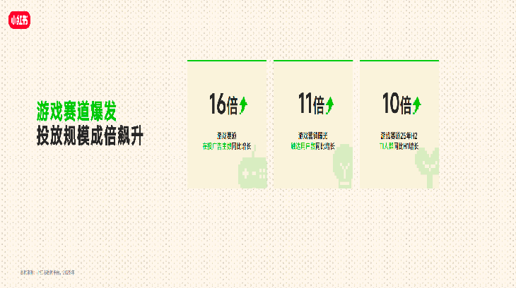 平台在大会分享中首先给出了大盘数据。2025年,小红书游戏赛道投放广告主数量同比增长16倍,越来越多游戏公司开始将其视为长期经营阵地;与此同时,深度兴趣人群数量在半年内增长超过10倍,触达用户规模同比增长11倍。