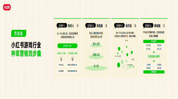 一条是“「种草用增」四部曲”——先找对人,再做拓展,然后把话说对,最后借势破圈;另一条是把这套动作按游戏全生命周期去排兵布阵。预热期先种兴趣,公测期放大有效内容和有效人群,长线运营期回到内容生态,持续拉升LTV,并打造平台共创事件活动,实现圈层突破。
