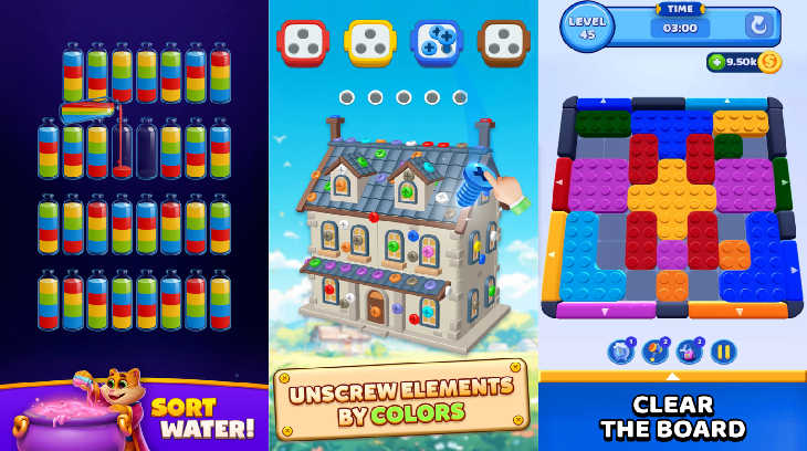比如Rollic发行的《Color Block Jam》,在方块赛道实现了2900%的收入跨越;排序类游戏凭借直观的视觉反馈打下获客成本,吃下泛人群流量,并养活了一批年入千万美元的“中坚产品”;而《Screwdom》则做了一个很好的产品迭代示范——将普通的螺丝解谜3D化,通过物理机制和卡关设计,做出了次月留存高达17%的混变爆款。