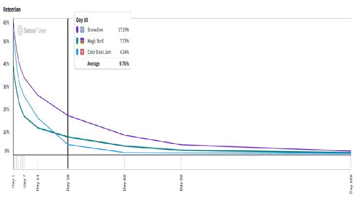虽然螺丝类的经验总结与方块类相似,但《Screwdom》相较于方块类和排序类头部作品展现出一个关键的差异化因素——长线留存能力。根据Sensor Tower的数据,《Screwdom》的美国D30留存率估计约为17%,远高于方块类的约4%和排序类的8%。