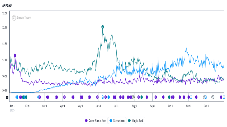 这一数据结合其令人印象深刻的ARPDAU,表明该品类不仅具有极强的漏斗顶端获客潜力,更有聚焦于长期变现核心“粘性”玩家群体的潜力。观察即将推出的螺丝类作品(比如《Word Screw》和《Happy Screw Merge》)如何利用这一基础与当前的行业巨头竞争,将是非常有趣的。
