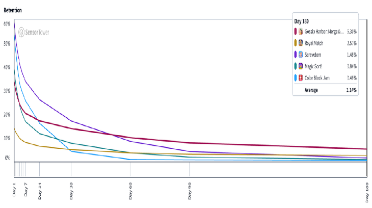 话虽如此,这些新兴品类面临的一个核心挑战,依然是如何创造出下一个像消除类或二合一类那样的“永生”品类——这些成熟品类的特征,在于其极强且稳定的长期留存曲线。在这方面,螺丝、排序和方块类仍有很长的路要走。