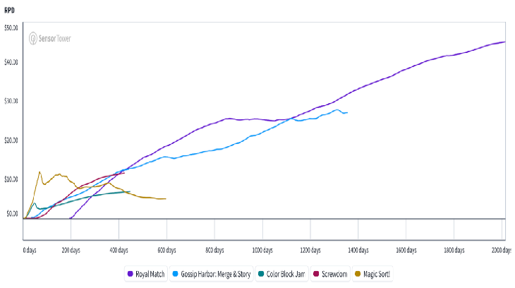这种留存差距可能会直接影响长期的买量盈利率,正如下面RPD曲线所示:虽然像《Royal Match》和《Gossip Harbor》这样的成熟领袖随时间展现出稳定的线性RPD增长,但《Color Block Jam》和《Magic Sort!》的增长则显得平浅或断续,这突显了将短期参与度转化为可持续长期价值的难度。