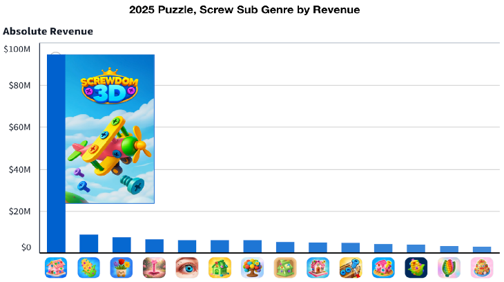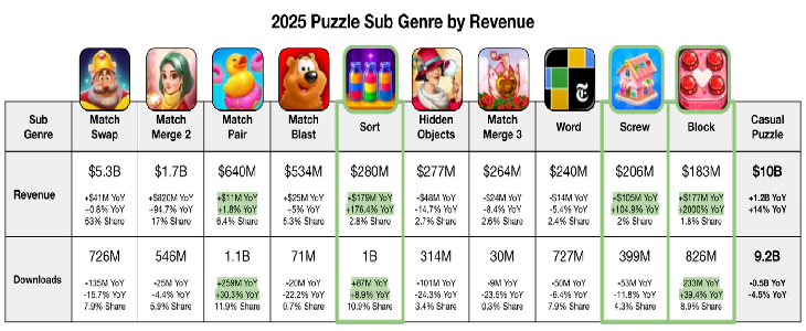 然而,2025年的市场数据却揭示了一个有趣的局面:在这个全年内购收入高达100亿美元的成熟市场中,传统的三消大盘趋于停滞,反而是偏向“小玩法”甚至“超休闲”的三个细分品类——方块(Block)、排序(Sort)和螺丝(Screw),联手跑出了超200%的爆发式增长。