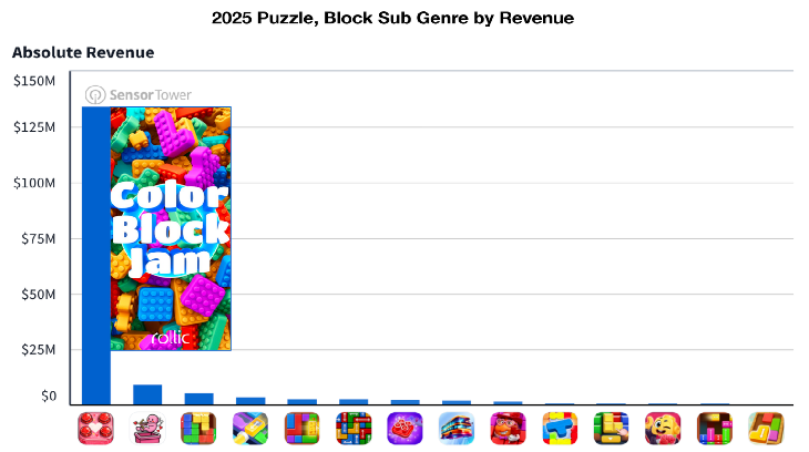 在多款产品的推动下,该品类下载量激增39.4%,凸显了该机制在漏斗顶端的强大魅力。收入方面的表现更为惊人,增长率高达2900%——尽管它目前仍是益智类中规模最小的细分品类(2025年收入约1.83亿美元),且大部分增长由单款游戏驱动。来自Rollic的《Color Block Jam》,目前占据了该细分品类约75%的收入。