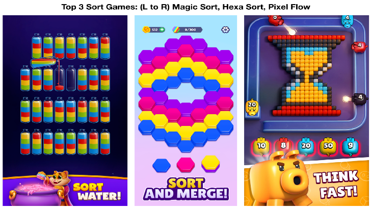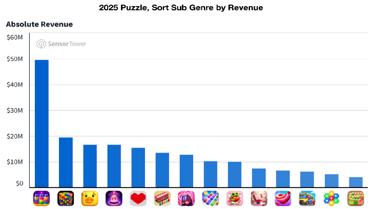 2025年,排序类游戏下载量约10亿次(仅次于配对类的11亿次),成为整个益智大品类最重要的用户导入漏斗。它也是收入排名第五的益智细分品类,2025年收入约2.8亿美元,同比增长176.4%。