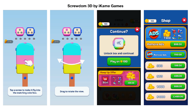 《Screwdom》的爆发式增长主要源于一次战略性的转变:从此前Rollic的《Screw Jam》等产品的2D视觉,转向沉浸式的3D物理谜题,引入了视角旋转并增加了空间推理的复杂性。关卡被设计为拥有有限数量的螺丝固定位,填满最后一个空位会导致“无步数可用”并弹出付费继续界面。这实际上是在人为制造挫败感和“卡关”状态,诱导玩家通过消费来克服机制障碍。