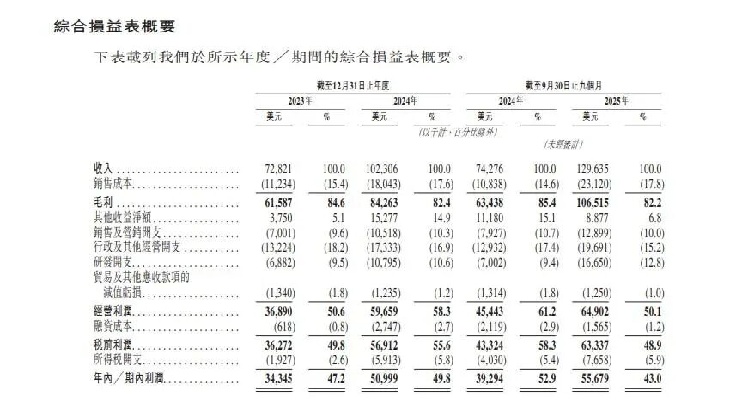 传统的广告代理行业通常面临人力成本高昂、毛利空间较窄的结构性问题。然而,钛动科技在招股书中披露了较为稳定的毛利率水平。2023年、2024年及 2025年前三季度,该公司的毛利率分别维持在84.6%、82.4%以及82.2%。同时,2025年前三季度的经调整净利润为0.57 亿美元,较2024 年同期的0.40 亿美元增长约42.5%。