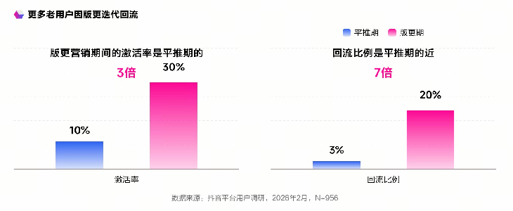 把老游戏的每一次大版本更新当作新游戏的首发来做,这在传统手游里并不稀奇,但现在这一模式被完美平移到了小游戏领域。白皮书数据显示,在小游戏版更营销周期内,激活率直接拉升到了平推期的3倍,而老用户回流比例更是达到了惊人的7倍。