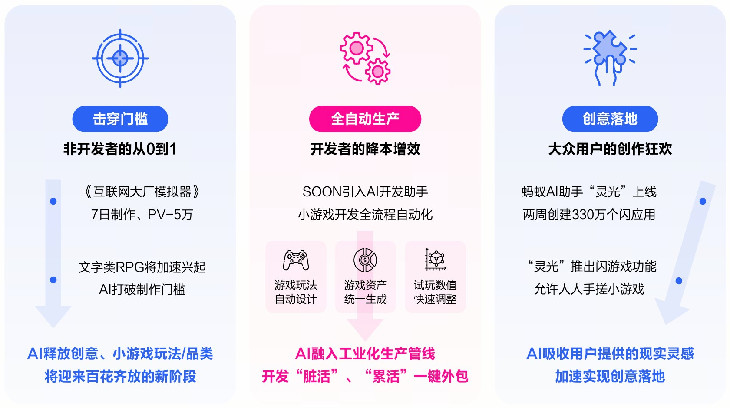 最后,不可忽视的是AI技术基建正大规模下沉至生产与发行的工业管线。在开发端,Vibe Coding(自然语言编程)理念伴随蚂蚁灵光、SOON等AI生成平台的落地,让《互联网大厂模拟器》这种纯素人手搓、7天内上线且日浏览量破万的文字RPG成为可能,大幅度将验证成本降至冰点。