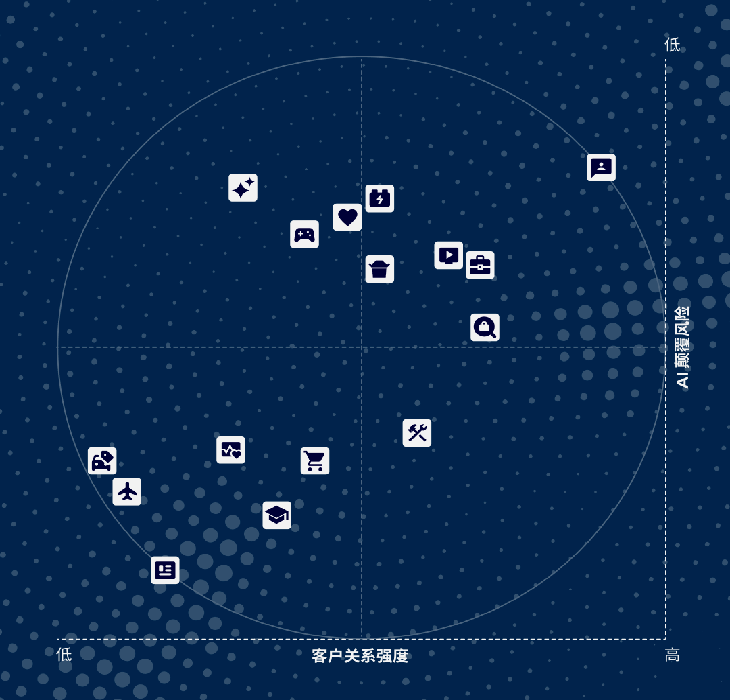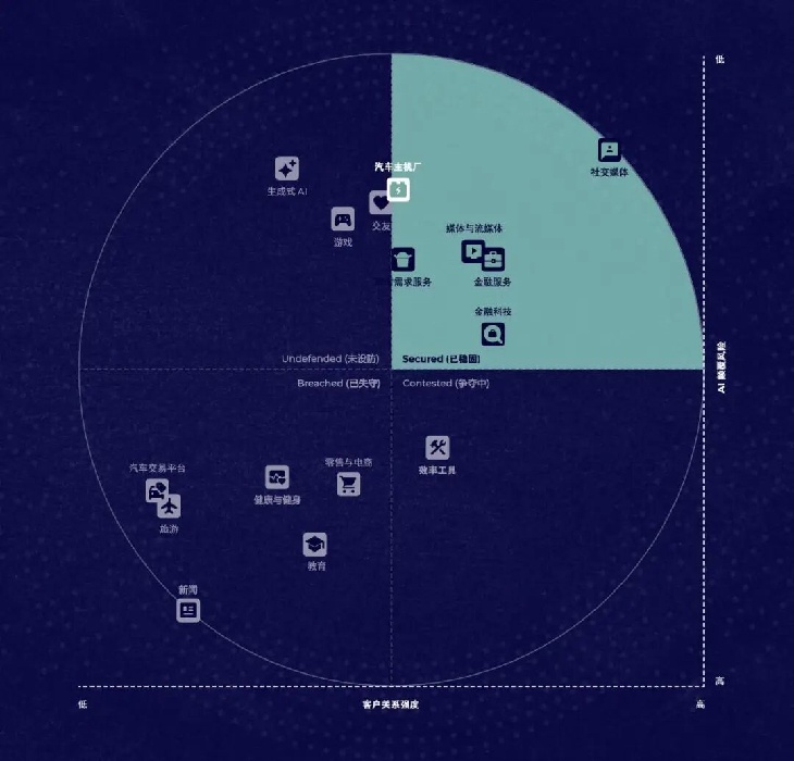 社交媒体、媒体与流媒体、金融服务、汽车主机厂以及即时需求服务(如外卖、打车)稳居这一象限。它们普遍面临较低的AI颠覆风险,同时拥有极强的客户关系。