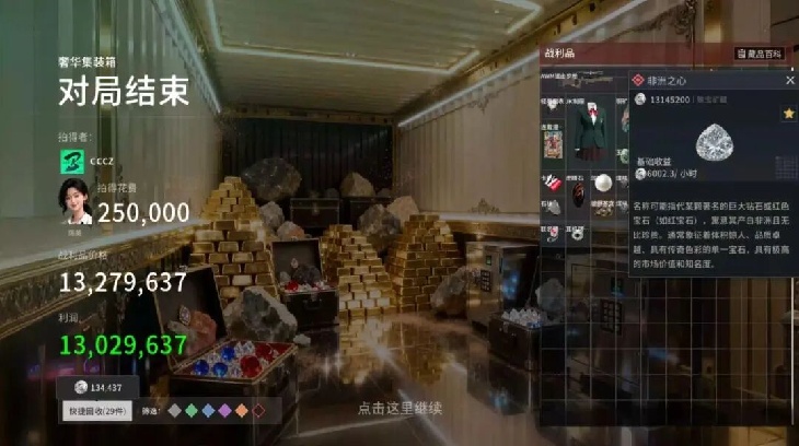 当竞拍一锤定音,胜者并不能立刻看清自己到底花大价钱买回了什么。屏幕上的藏品是在开箱读条的过程中,一件一件从迷雾中缓缓剥落显现的(音效完全照搬的《三角洲行动》)。这种类似刮开彩票涂层的设计,将玩家的情绪反馈曲线拉长。