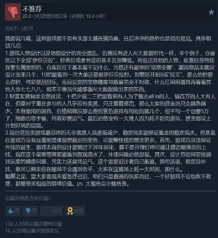 当然,不可回避的是,当潮水般的流量涌入,这款游戏在底层架构上的脆弱也暴露得一览无余,这也是它好评率难以突破半数的核心原因。