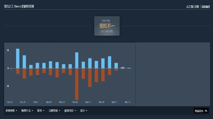 不过,亮眼的峰值在线并没有为它换来一边倒的好评。目前它的Demo 在Steam 上的好评率徘徊在49%左右,整体评价被定格在相当割裂的“褒贬不一”。