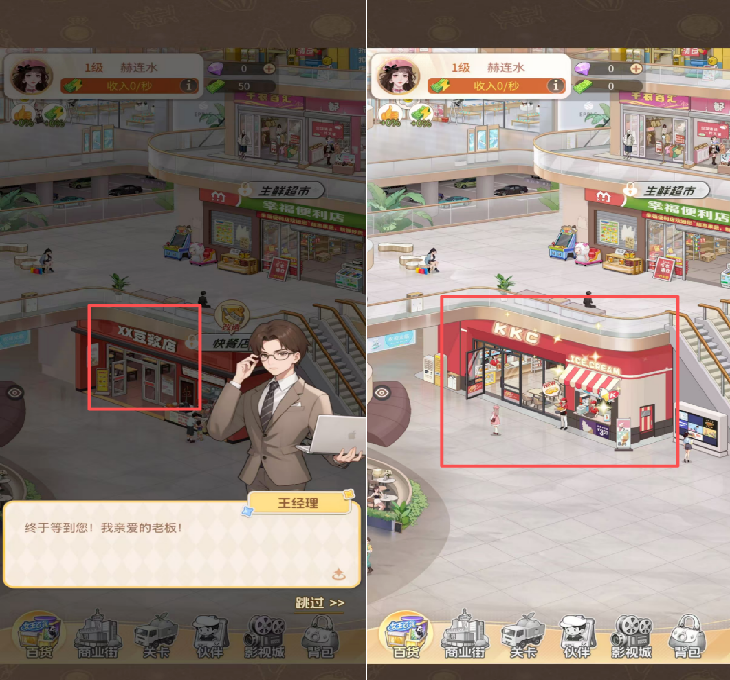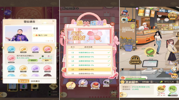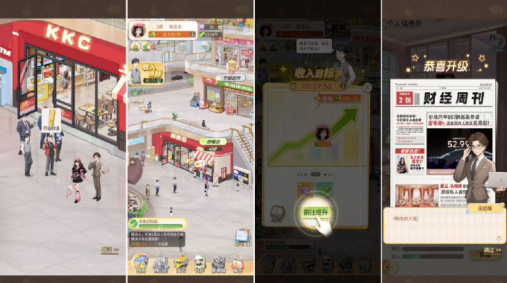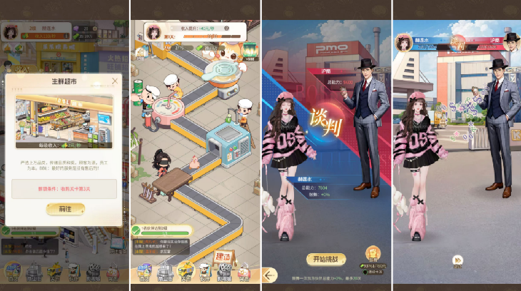 场景部分,《时尚百货城》将初期所有经营场景锚定于商业中心,在用户心智上更为具象化,降低了“厚重感”。这里的影响因子在于:若是围绕“世界”,用户印象上营收场所之间相互独立,后续养成具有“取舍”的心理。而划定场景的商超,每个营收场所的解锁及养成提供了进一步的合理性外,呈现“同步提升”的心理属性。