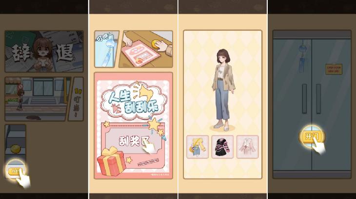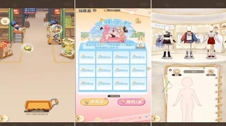 第一个设计逻辑,在于其他场景定调。《时尚百货城》每解锁一个养成场景及子玩法,都会新增一个休闲玩法。《时尚百货城》内,解锁关卡2则是限时点击泡泡获取商品,关卡3则是通过客户的划定范围谜题进行轻量解谜匹配,关卡4则是点击开盲盒。产品特质会略近似于游乐场类游戏或派对游戏。相对地,资源及养成提供了玩家对后续这些玩法的定向游玩着重,比派对游戏或游乐场类游戏更体现明确目标。