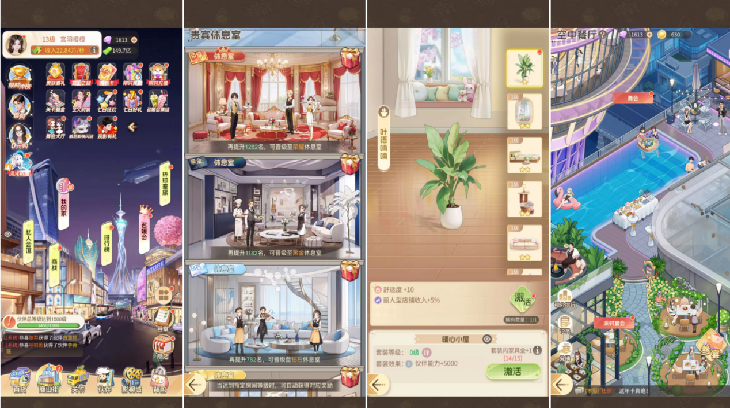 第三重设计逻辑,在于整个游戏架构。如果我们拿中重度男性向游戏进行对比划分,这些玩法具有一定的研究深度,从A玩法到B玩法会需要海量的重复次数实现,整个游戏的核心玩法仅为有限数量。在《时光杂货店》类游戏设计中,除了玩法规则海量、轻便、易理解,每个玩法具有显著的较短时间周期,并且具有“解锁B场景后往往A场景可不再体验”的特征。在《时尚百货城》中,游戏理解成本、交互玩法成本、时间消耗成本上都是轻量化的,但“单店——得到员工——提升单店竞争——供应链关卡——多店拓展营收——提升自我——海外考察——经营到投资”整个游戏内容链路规模是厚重的。并且,《时尚百货城》除了游戏内容体量体现之外,还有持续游戏驱动力搭建。细分上,《时尚百货城》在用户驱动力上围绕“寂寂无名——商业报道——贵人帮助机遇——自我审美提升——社交圈层——生活质量”这个链路。在这个驱动力链路上,《时尚百货城》随着玩家收益提升的时候,还传达出奢华环境、个人审美提升、向上圈层社交等系列特征,使得整个游戏内的“搞钱”变得更有意义。所以,整个《时尚百货城》到后续衔接的,是玩家账号自身的换装、家居装扮等一系列外观向内容,并在此基础下形成轻社交竞争——“小团体圈层攀比”。