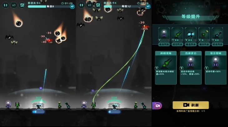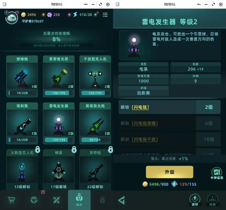炮台方面,通过挑战关卡获得金币和图纸,消耗金币和图纸提升炮台的等级,进而提升基础伤害。达到指定等级时,还能解锁额外的效果/能力,大幅增加其在局内的战斗力。