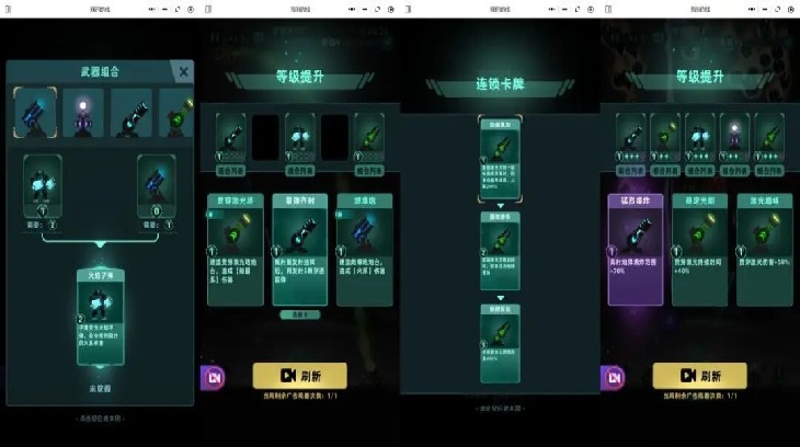每一次武器强化,会提升一颗星,累计三颗星后,下一次会出现“进阶卡牌”,选中后武器会提升星级,进而解锁新的可选内容。由此可见,不同的武器类别,搭配多样的强化项,以及不同敌人的抗性差异,共同组成了游戏的多样性及策略性。