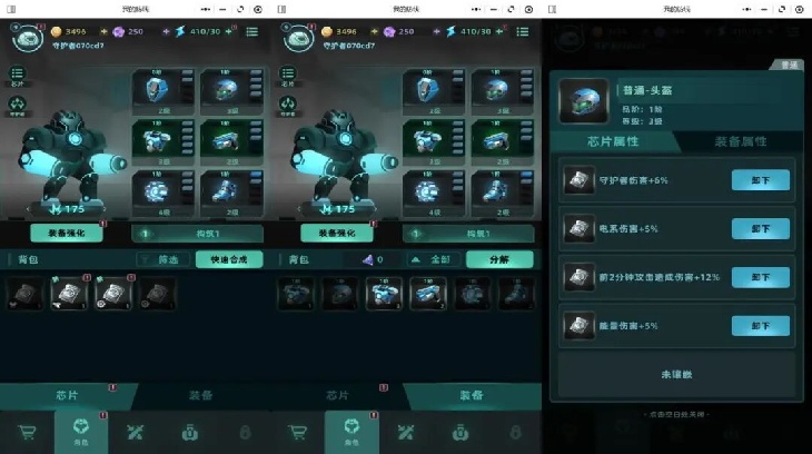 角色方面,可以为角色更换装备以及强化装备。同时,每件装备还有5个槽位,用于芯片镶嵌。芯片拥有丰富多样的能力效果,可以有效提升角色的战斗力,优秀的搭配甚至可以针对性强化某几种伤害类型,进而构筑强大的战斗流派。