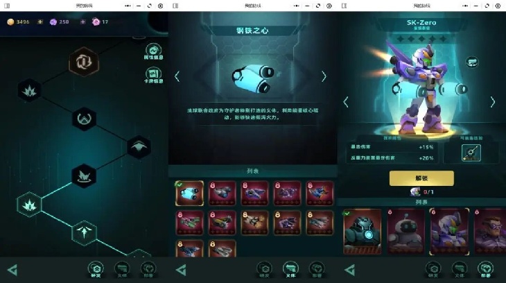 此外还有“守护者”系统,包含全面提升属性的“研发”系统、可以提升最终伤害的“义体(武器皮肤)”系统、以及提升暴击伤害和单一炮塔伤害的“部署(皮肤)”系统。