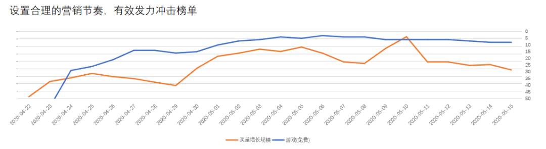 预热推广期,成都品游提前一周测试素材,并找出吸量素材,预热买入新进,逐步提升榜单排名,观察爬榜裂变率,调优新手引导;