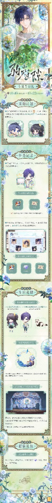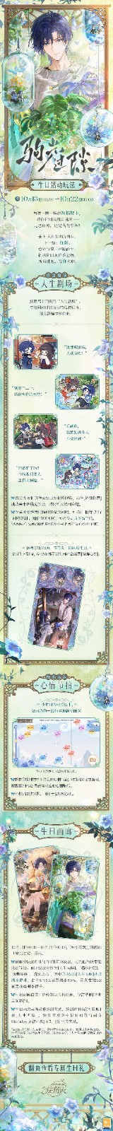 10月22日05:00,参与司岚生日活动「驹光过隙」,在生日当天与他共度,完成剧情即可免费获得1张生日纪念画灵[洄游心契]。