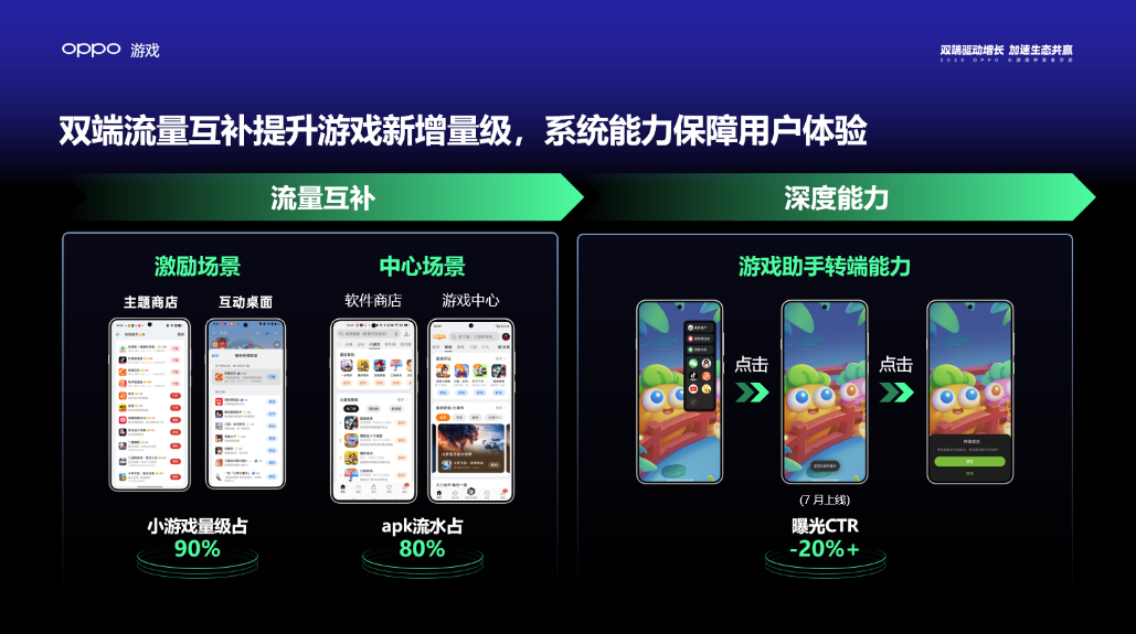 据OPPO小游戏业务负责人钟青海介绍,OPPO 游戏已构建贯穿用户全生命周期的双端增长引擎,通过小游戏与游戏应用的协同联动,形成 “拉新 – 沉淀” 的完整闭环。