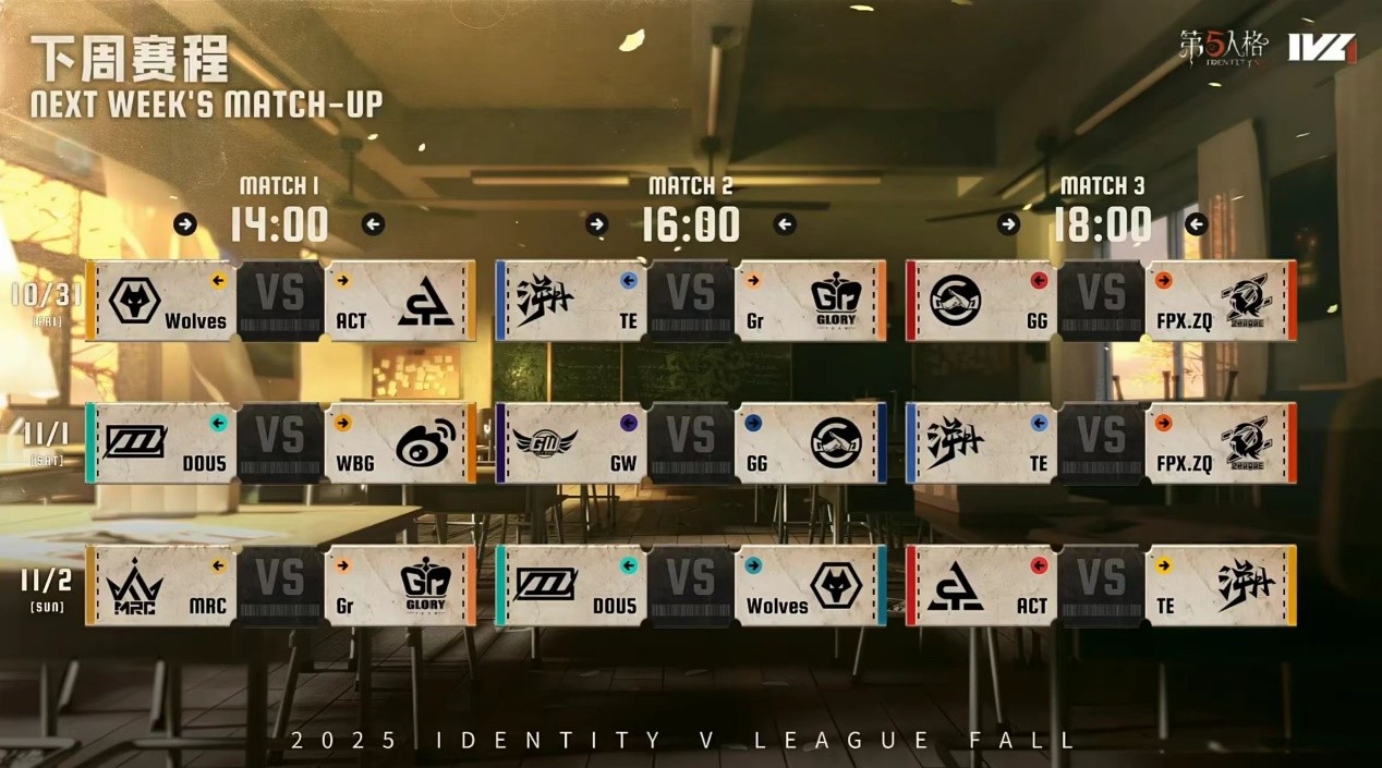 本周状态火热的TE将在下周迎来一周三战的艰巨赛程,他们能否继续保持势头,溯流直上呢?榜首的MRC和第二名的Gr将迎来二番战,第一回合双方你来我往,贡献了一场精彩纷呈的盛宴,此番再战,两支目前表现最亮眼的战队又会擦除怎样的火花呢?敬请期待10月31号14:00第五人格赛事直播间,我们不见不散。