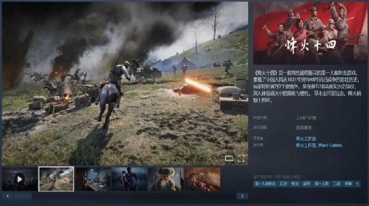 《烽火十四》的公开信息很硬,几乎是把验货标准直接递到玩家手里:Steam上的定位是线性剧情驱动的单人FPS,时间跨度从1931 到1945;开发者是烽火工作室,发行为Wave Games。关于内容的具体承诺也写得很清楚:游戏包含7 位主要角色、16场真实历史战役。