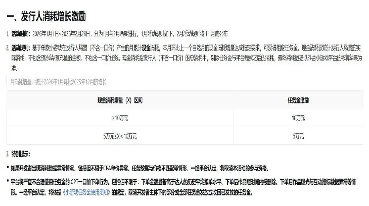 先看发行人消耗增长激励。政策明确规定,激励基于单款小游戏在发行人场景(不含一口价)产生的月累计现金消耗,并以本月相较上一个自然月的现金消耗增量作为唯一考核基础。以2026年1月为例,统计的是2026年1月相较2025年12月的现金消耗增长: