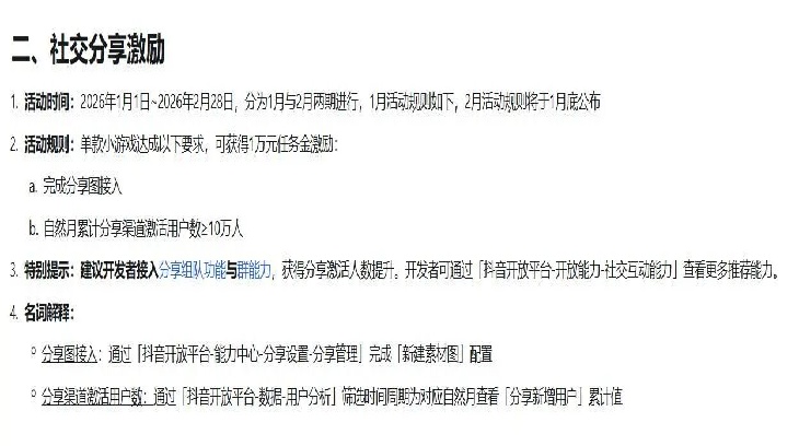 与以往围绕流水规模或返现比例的激励不同,抖音小游戏在2026年1–2月推出的「内容&社交增长激励」,第一次把激励重心明确放在了增长的增量与过程。