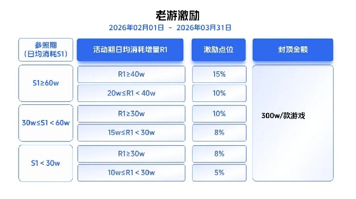 对于同发新游——即抖音小游戏投放时间不晚于其他平台的新产品,只要满足过程指标要求,且活动期日均消耗增量R1 ≥ 1 万元,即可直接获得40%的激励点位,单款游戏激励金额封顶400万元。这极大降低了新品在抖音生态中进行首发或同发测试的成本门槛。