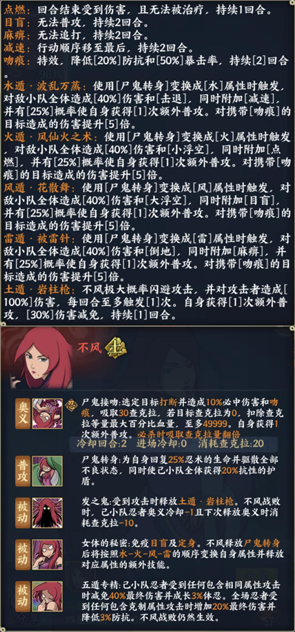 被动Ⅱ:女体的秘密:免疫目盲及定身。不风释放尸鬼转身后将按照水-火-风-雷的顺序变换自身属性并释放对应属性的额外技能。