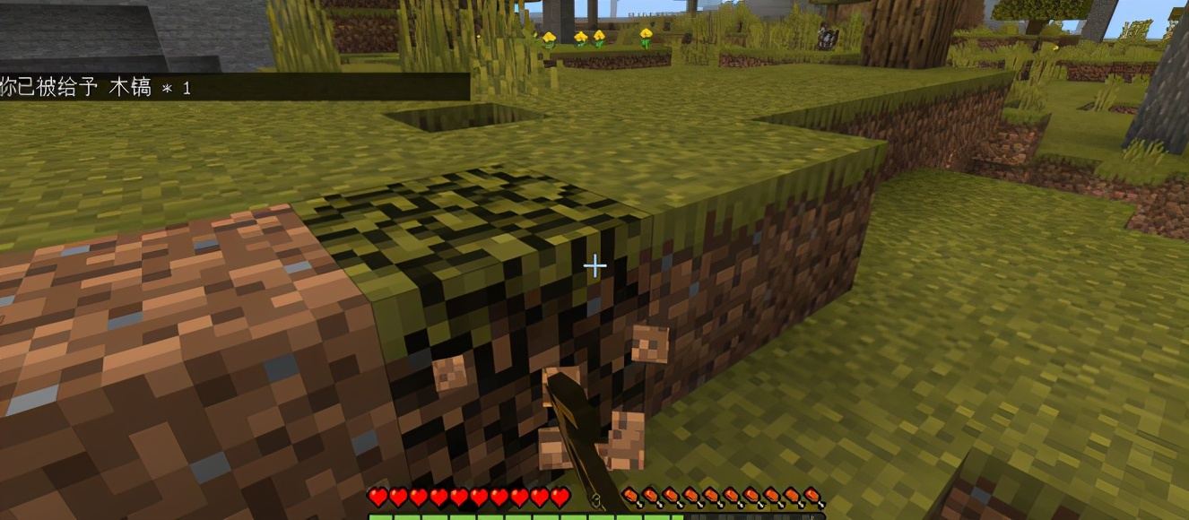 要注意,这把镐子只能在生存模式下使用(注意生命安全!)我们来试试做好的新镐子吧~随便挖一下,就能出来很大一个坑呢?