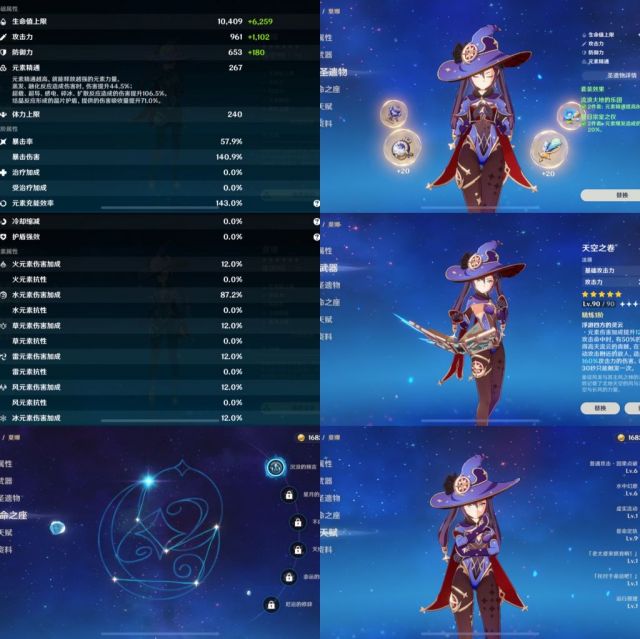 莫娜佩戴了精通沙提高大招爆发,同时佩戴了2乐团进一步提高精通,选择天空书而不是流浪是因为没拉流浪,实际上流浪爆发更高。暴击堆到50多,单段伤害好凹。达达利亚也戴了精通沙漏,选择佩戴天空而不是绝弦的原因是圣遗物是临时凑的,绝弦不好配装,实际上绝弦伤害更高,但公子作为主C一般不会选择绝弦也是真的。暴击堆到50多,单段伤害好凹。