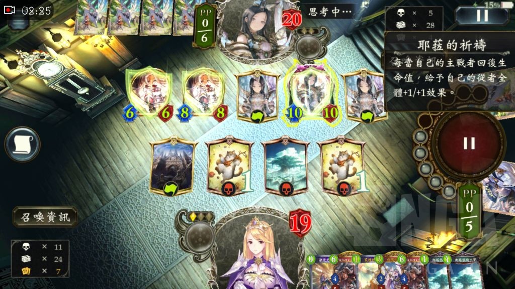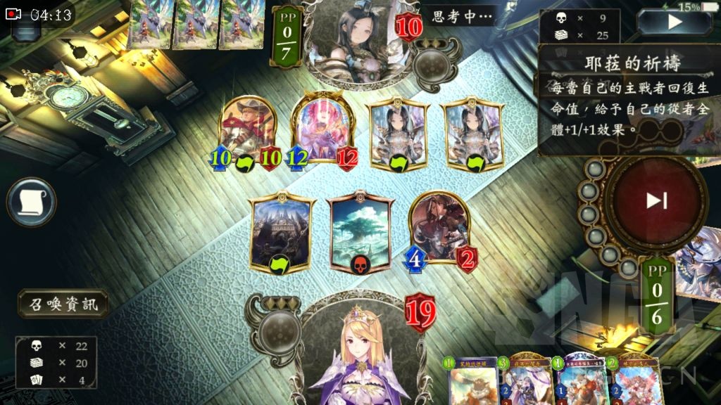 对面把三回合下的罗蕾娜的1费token和第二张0费神父给用了,从1血濒死直接战斗续行血条回一半,我还以为你是爷爷呢……(指fgo中的冠位狂。)然后对面场上两个超级大怪,我束手无策,只能左上(