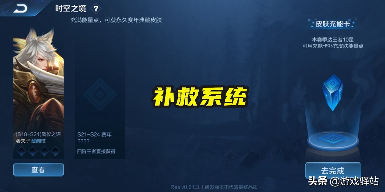 值得一提的是除了年限皮肤官宣外,天美还将在新赛季推出“时空之境”系统,该系统给予了没有积满王者印记的新入坑玩家,以及因为印记中断错失皮肤玩家的一个可以补救的机会,举一个简单的例子,比如小编S17-S20赛季只拿到了三个印记,还差的一个印记可以通过“时空之镜”完成充能任务达成四印记,目前体验服的充能任务是赛季段位达到最强王者10星,只要玩家完成任务就能获得一张皮肤充能卡,且一个赛季只能获取一张哦!
